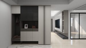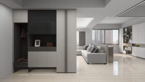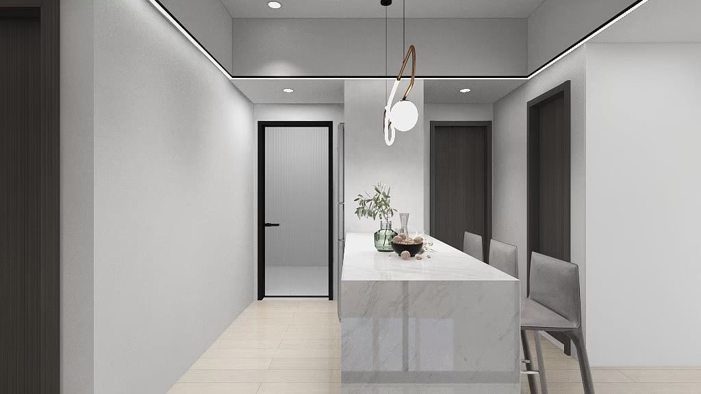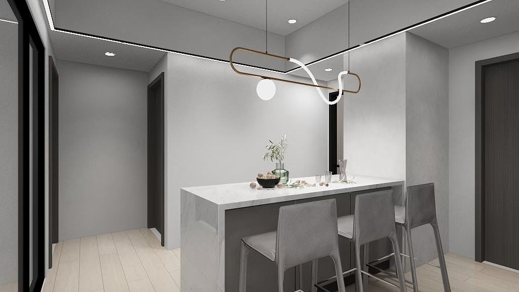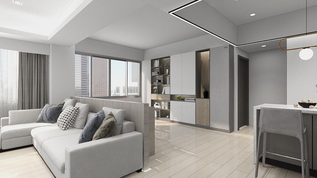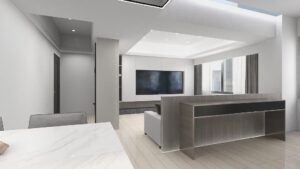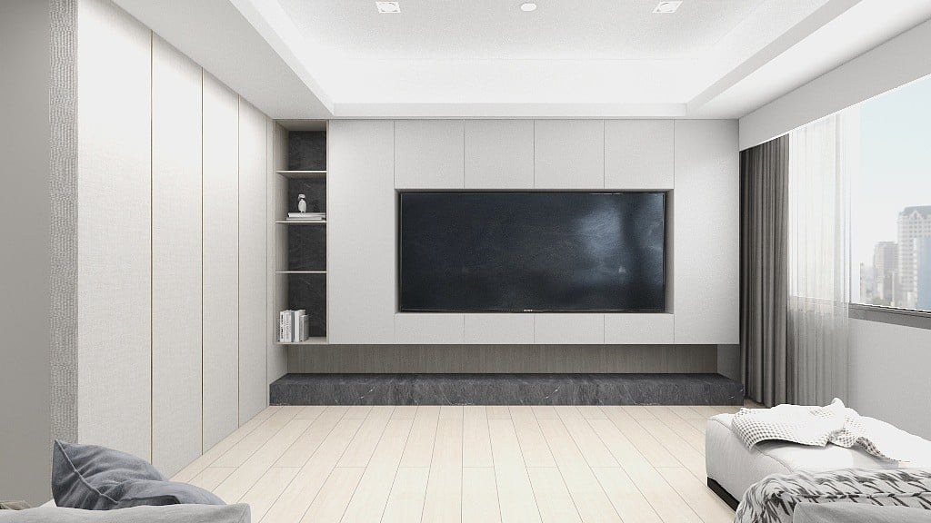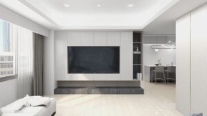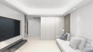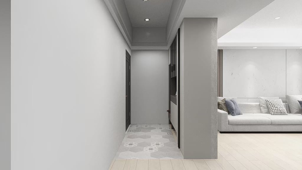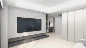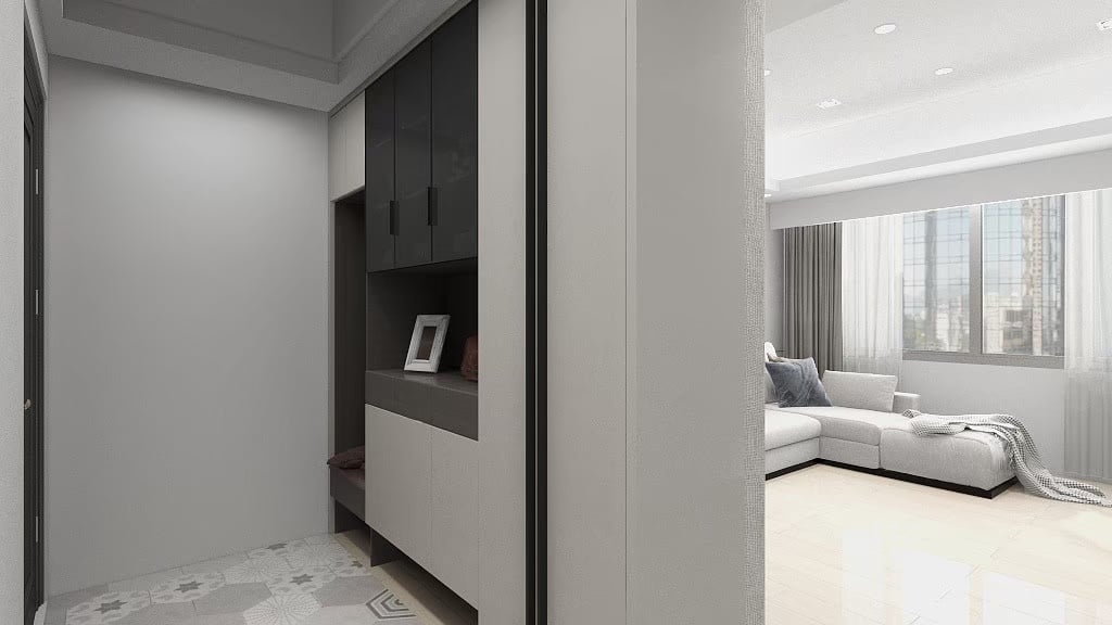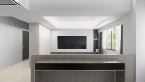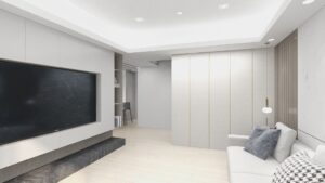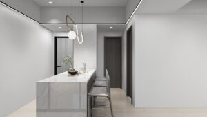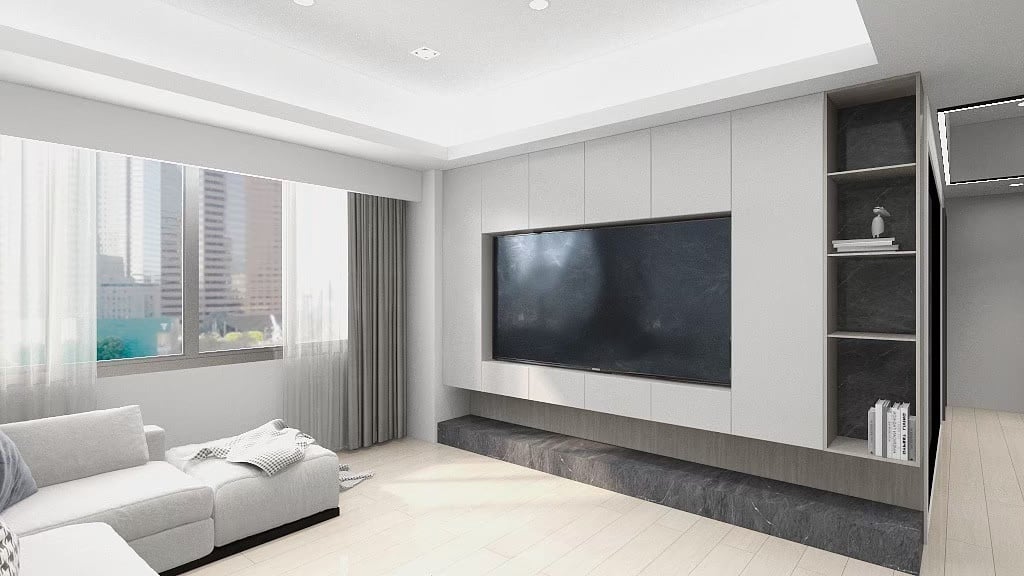 本案以淺灰白為基底,融入深色石材基座與俐落櫃體設計,構築出一個既柔和又理性的現代空間。簡潔的線條,搭配間接光源與自然採光,讓生活在其中的每一刻,都顯得乾淨、安定而有層次。