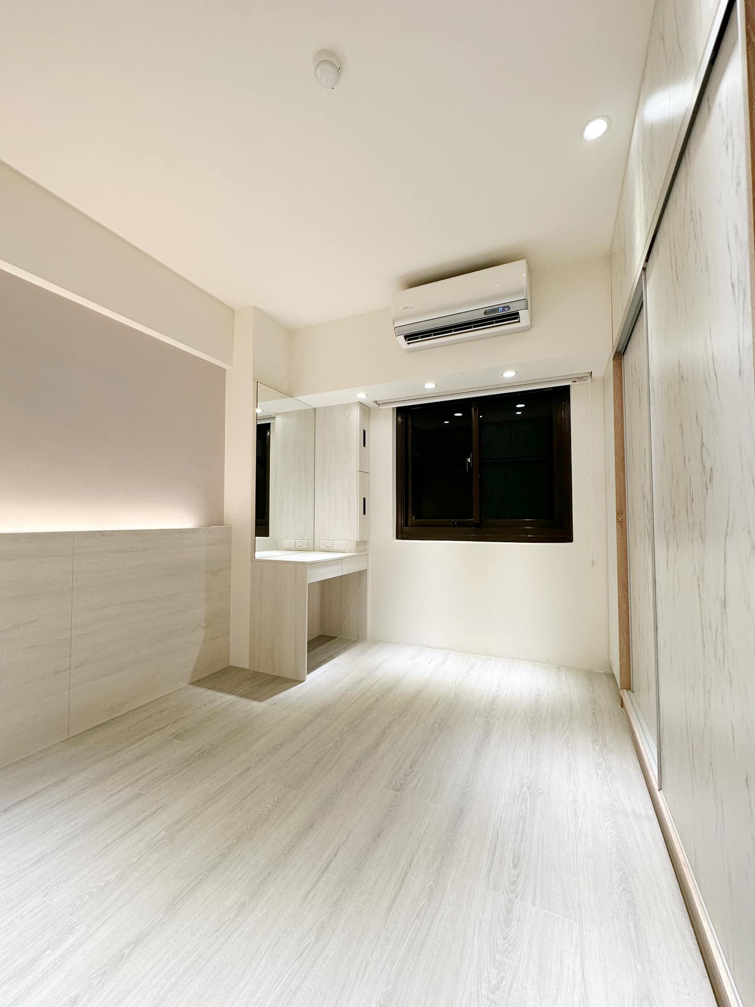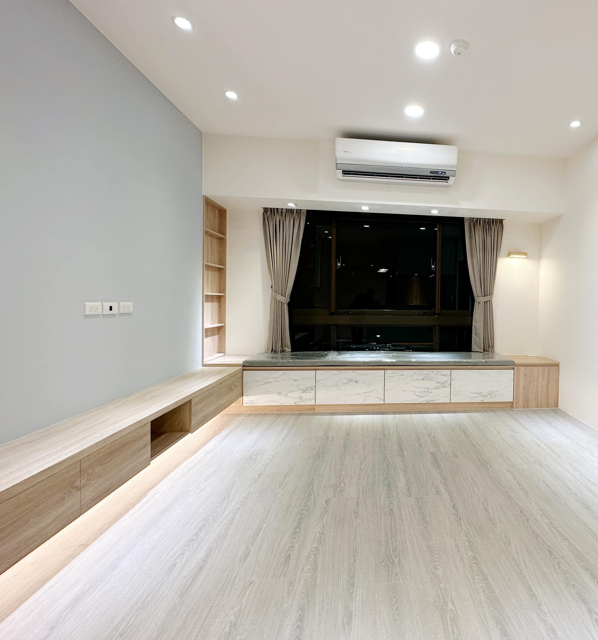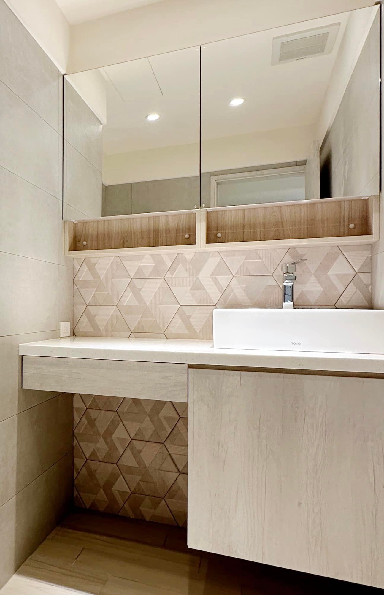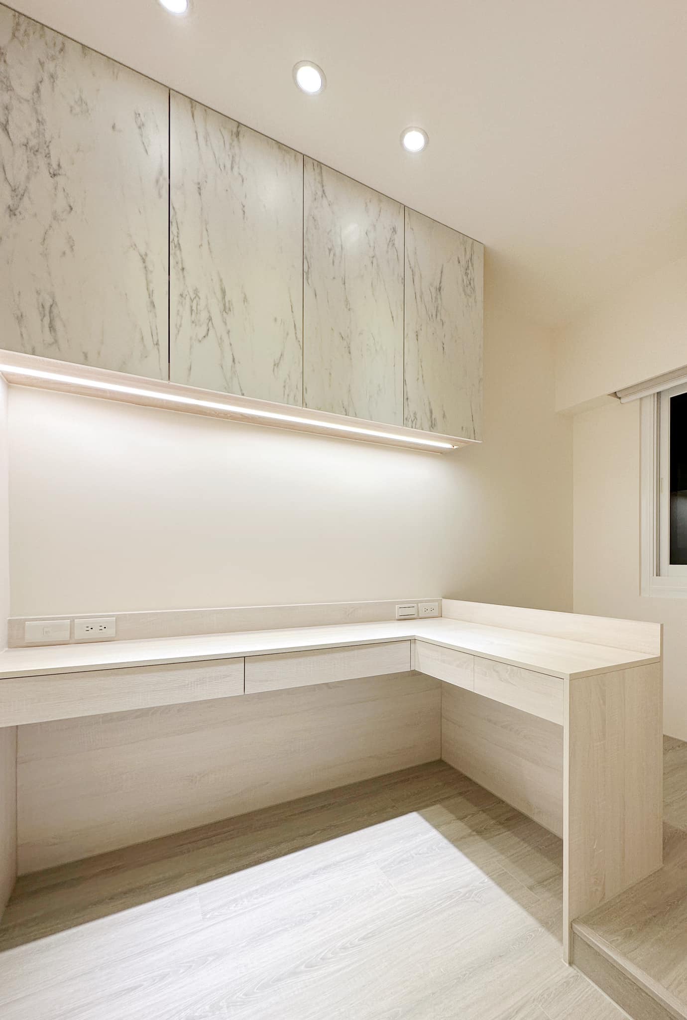 以淺木紋與石紋板材作為主軸,透過俐落的線條與隱藏式收納,讓空間在簡約中保有層次。懸浮櫃體搭配間接照明,不僅延伸視覺,也讓生活多了一份溫度。從玄關、餐廳到客廳,在材質與光線的交織之下,形塑出一個 安靜、舒適、剛剛好的家。