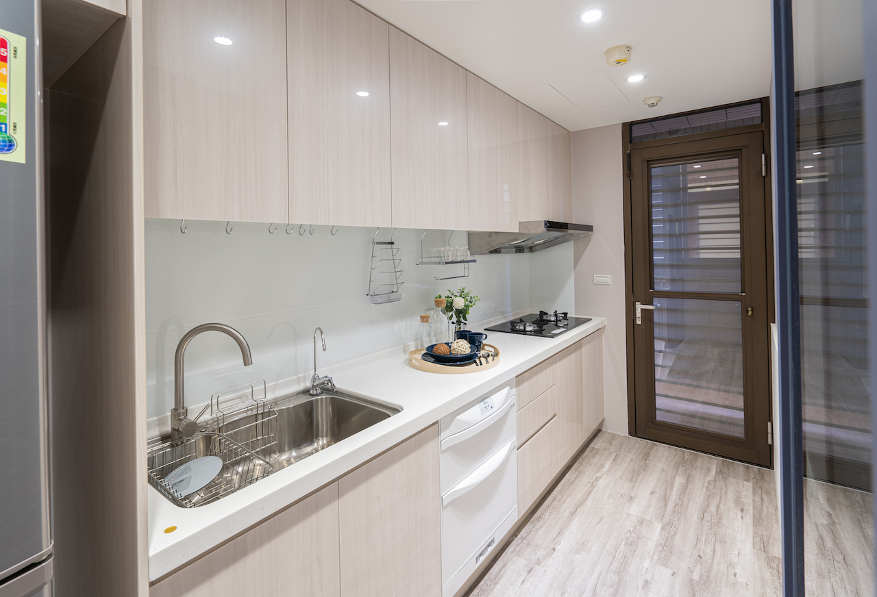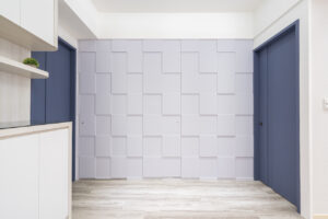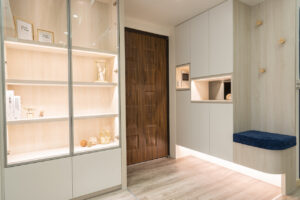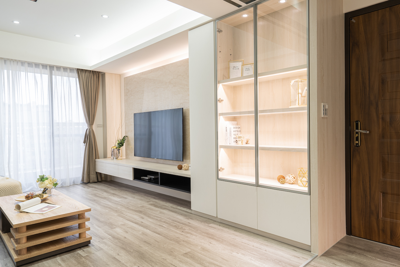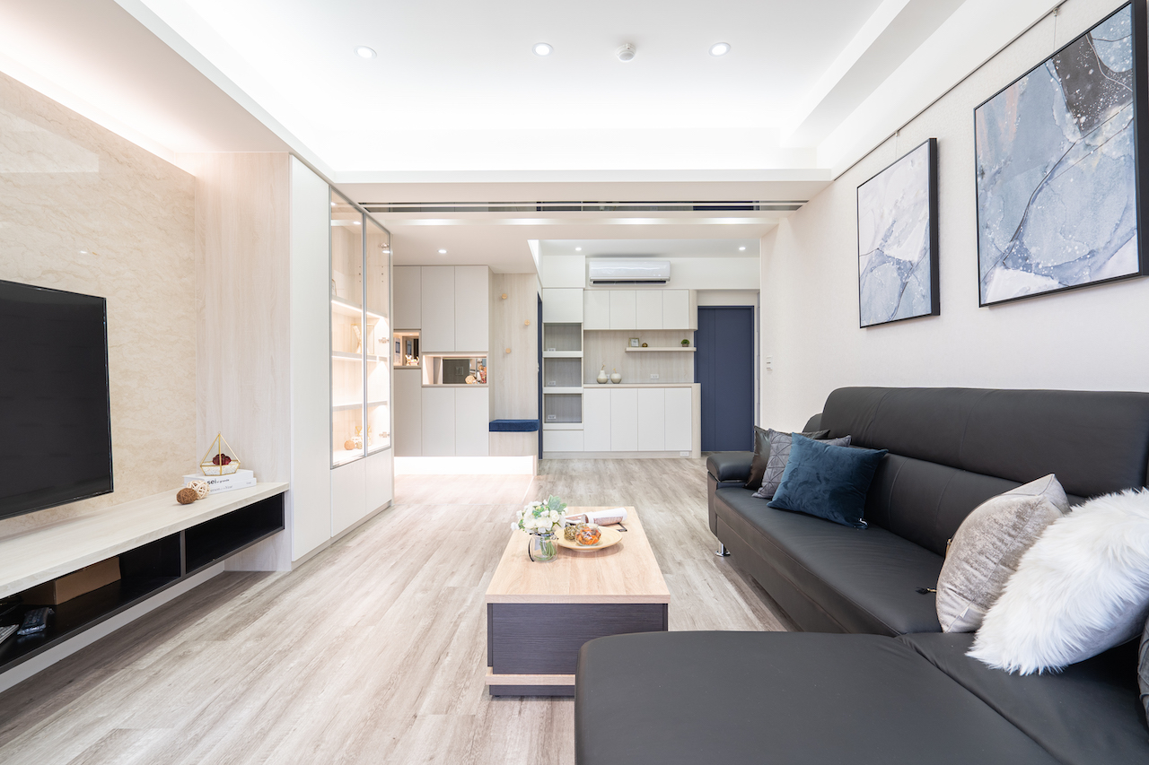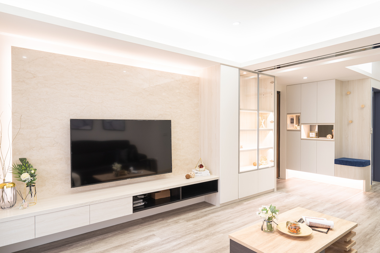 空間呈現簡約現代的純淨印象,以淺色系和基礎線條、架構出充滿親情的生活領域, 一進門的玄關賦予端景規劃,一些飾品、生活小物讓進門的視覺被吸引.