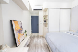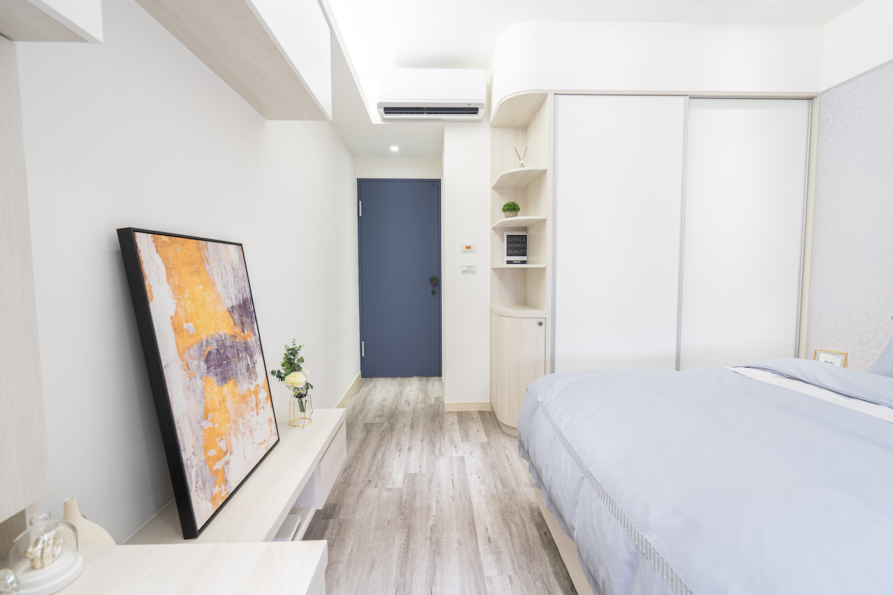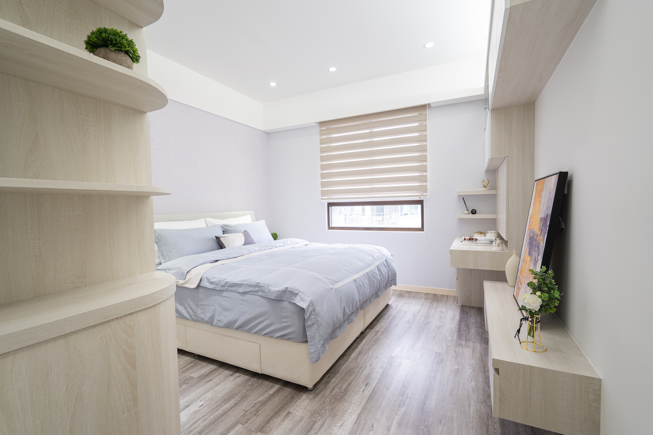 淡紫色的主臥,除了延攬寬闊的視野,維持收納機能,讓空間簡單也不雜亂,滿足使用者的生活所需!把睡眠空間佈置到如同寄宿旅店般,在舒眠機能下,也能帶出個性和日常生活的痕跡。