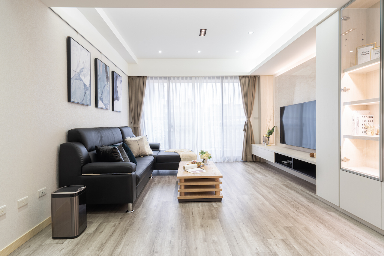 客廳電視牆簡潔的設計,延伸出通透明亮的空間感,讓人感覺簡約無壓的舒適感,牆面掛上抽象的掛畫,成為空間視覺的焦點,落地窗導引光線在室內穿梭;享受日光的溫暖.為溫馨的生活感加分.