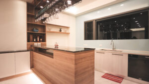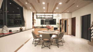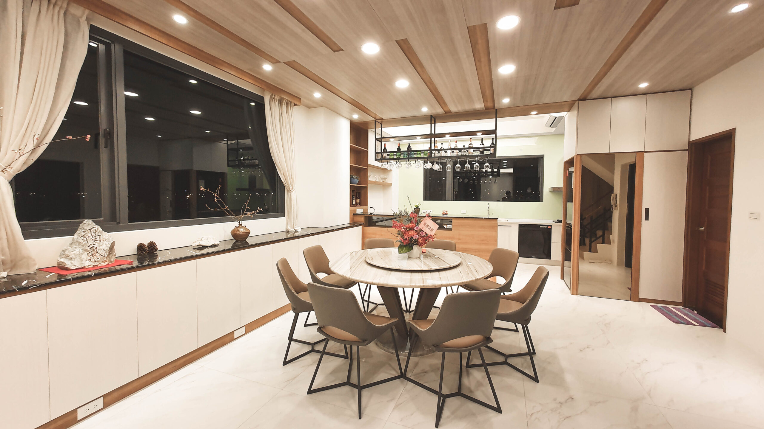 溫暖的陽光伴隨著落地窗灑落在屋子的每個角落,開放的格局搭配線條描繪壁面、櫃體,鐵件與木紋的冷暖質感搭配,展現光影的視覺美學。