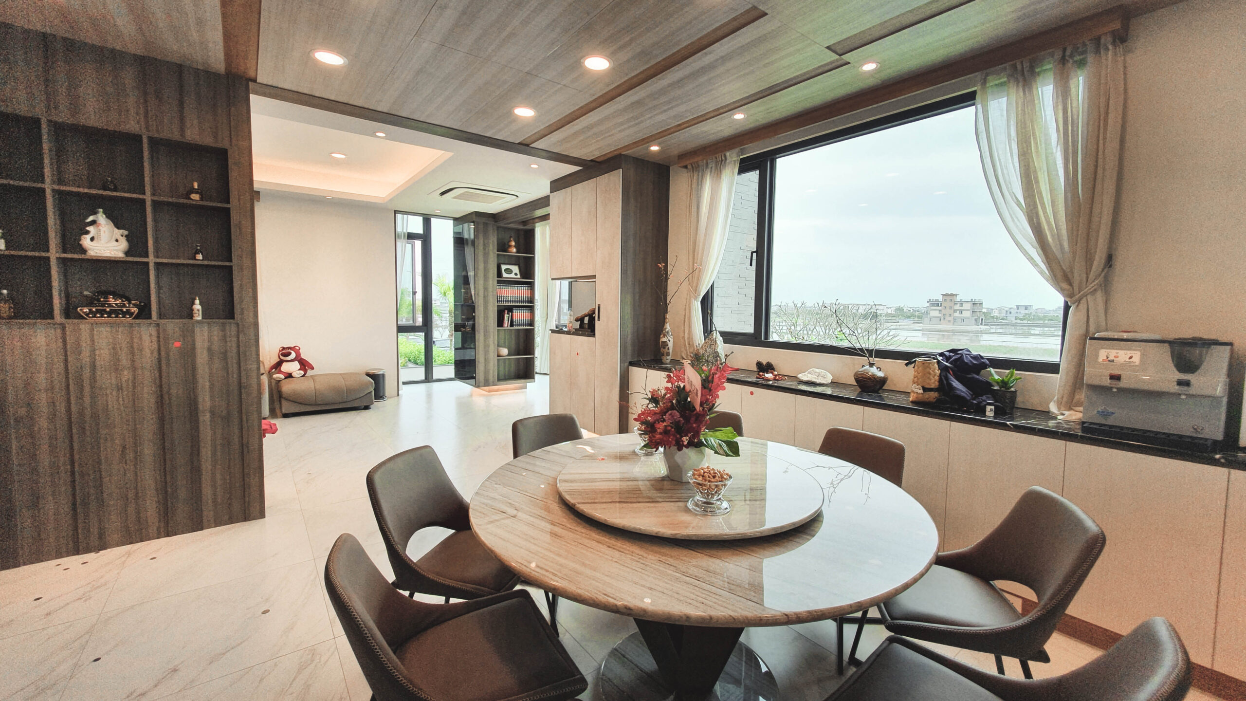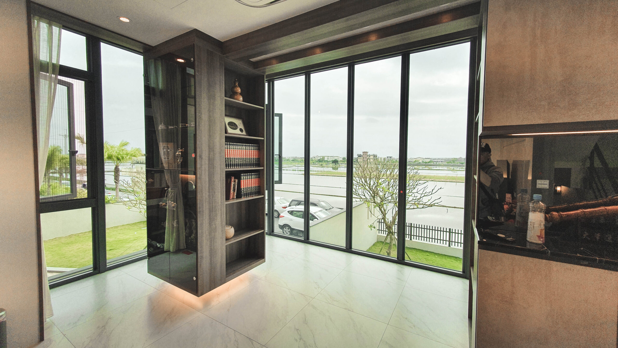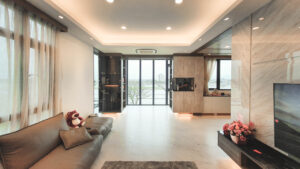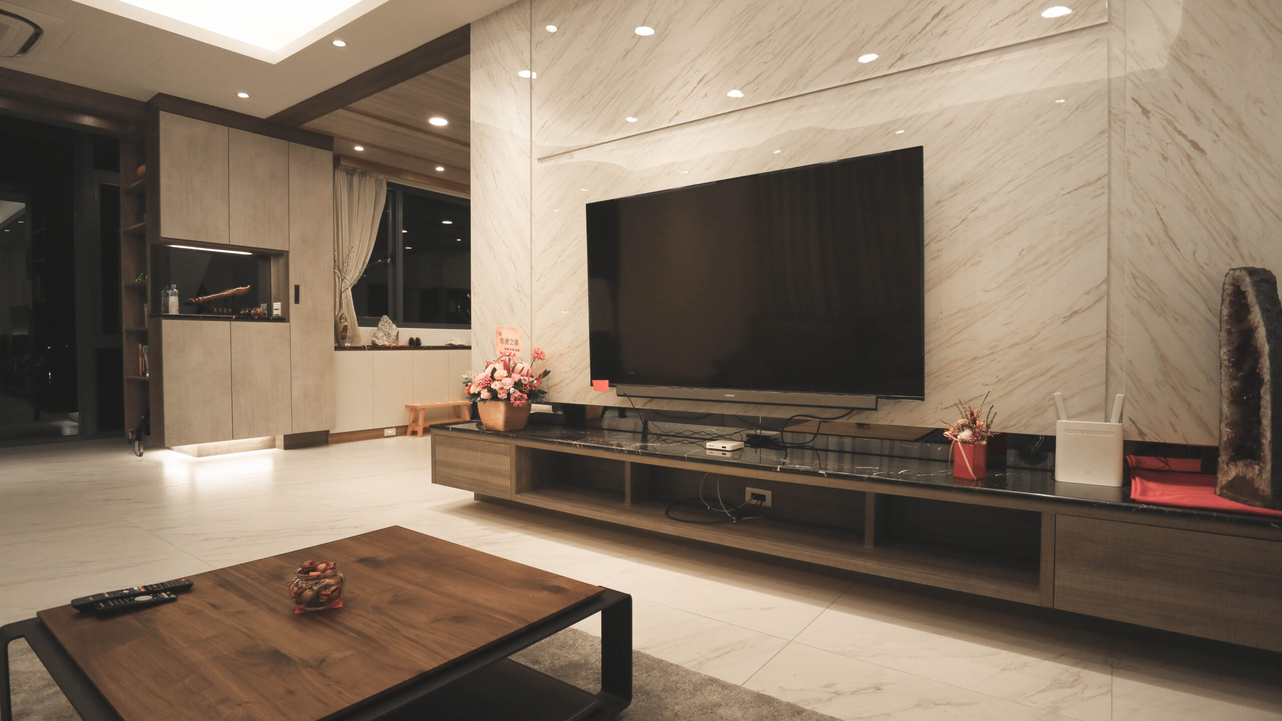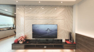 大理石材為基底的電視牆,展現大器氣勢,下方簡約的電視櫃,視覺中隱約透露出細膩的黑色質感.白色沙發呼應整體室內空間,客廳原本有支明顯的大柱子、藉由書櫃規劃、茶鏡與照明的展示機能魔法,讓整根柱子消失了,臨落地窗區打造休閒開放閱讀領域。