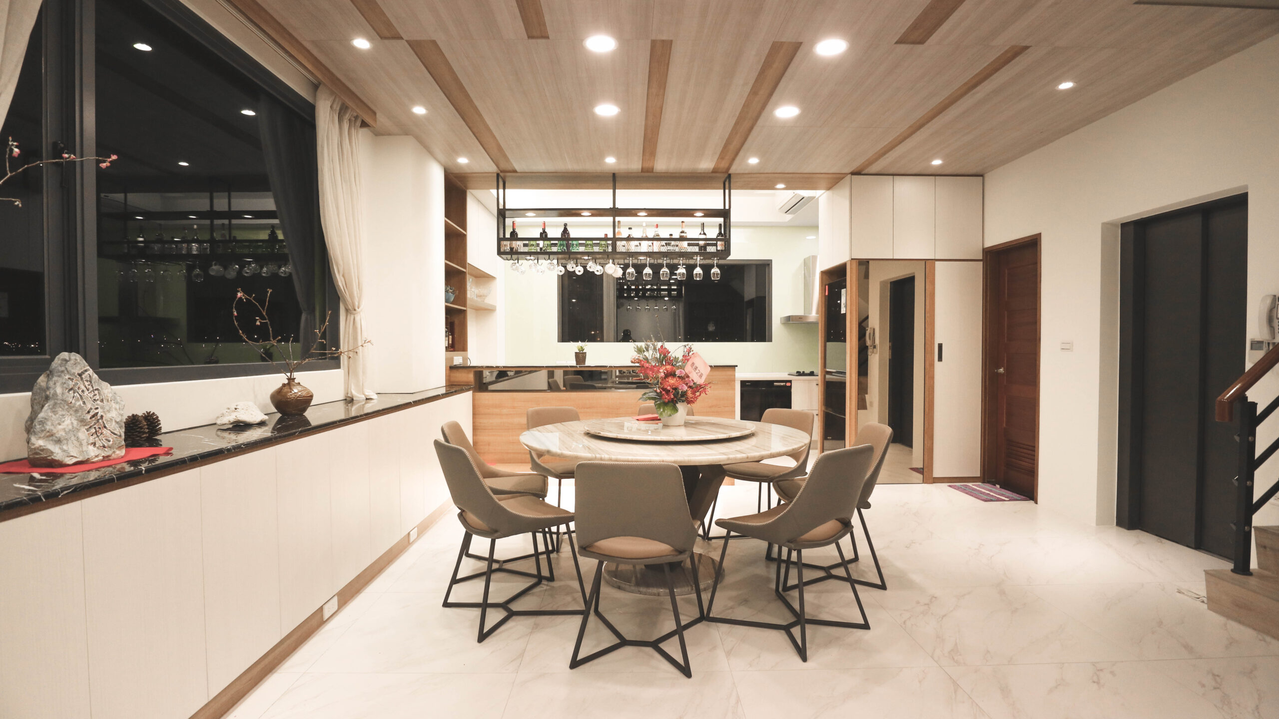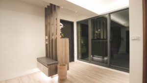 1F玄關區鞋櫃整體向上延伸,經過開放的展示櫃體,伴隨燈光的安排,雙面兼具收納以及穿鞋椅的功能