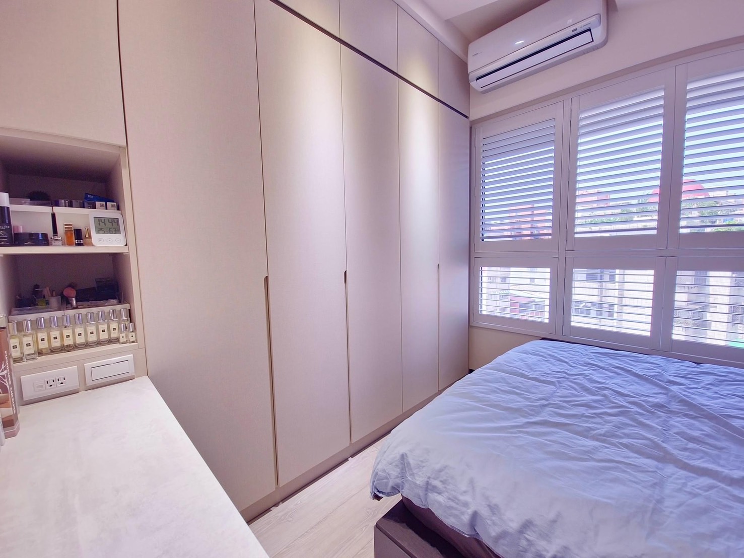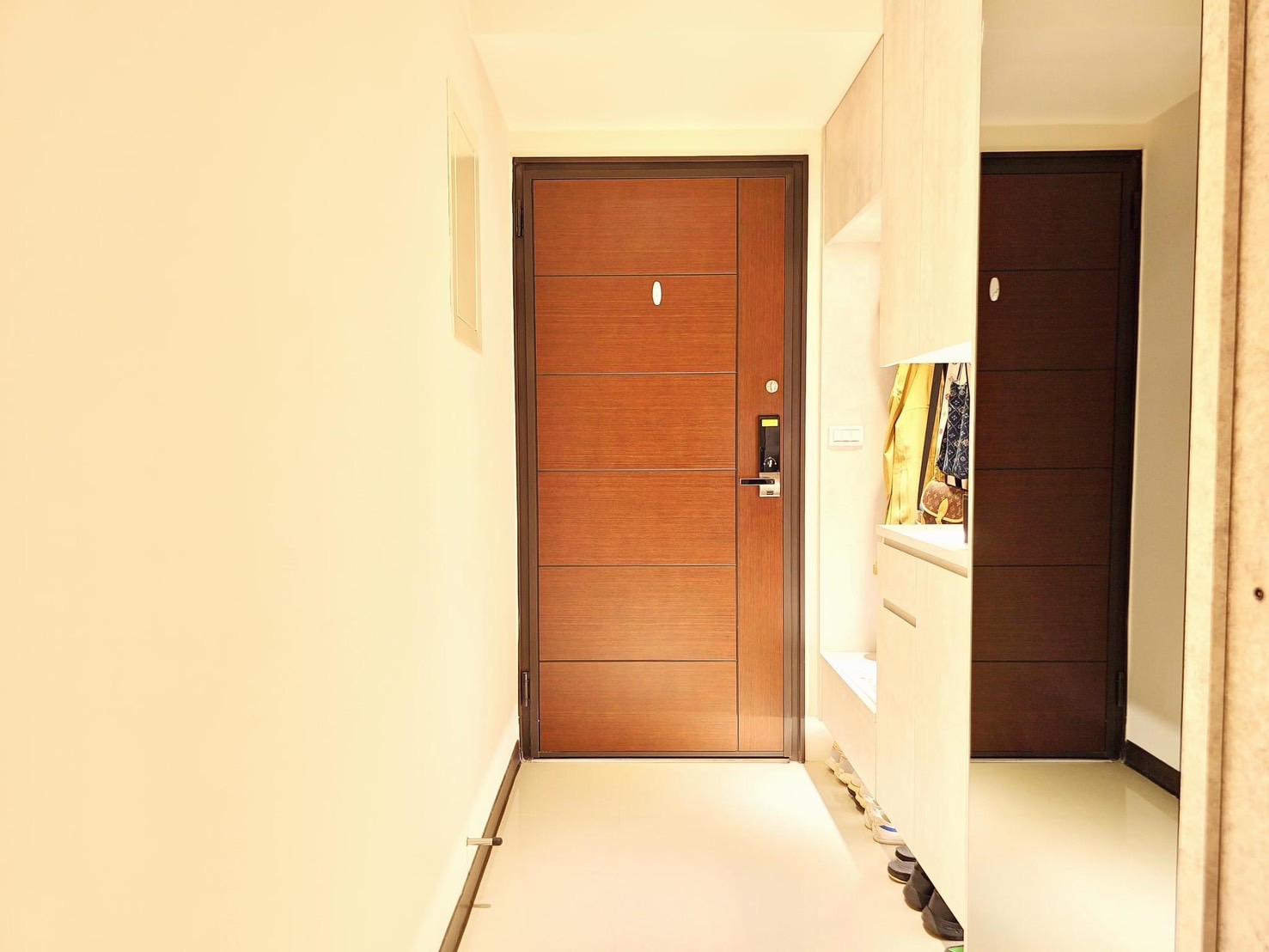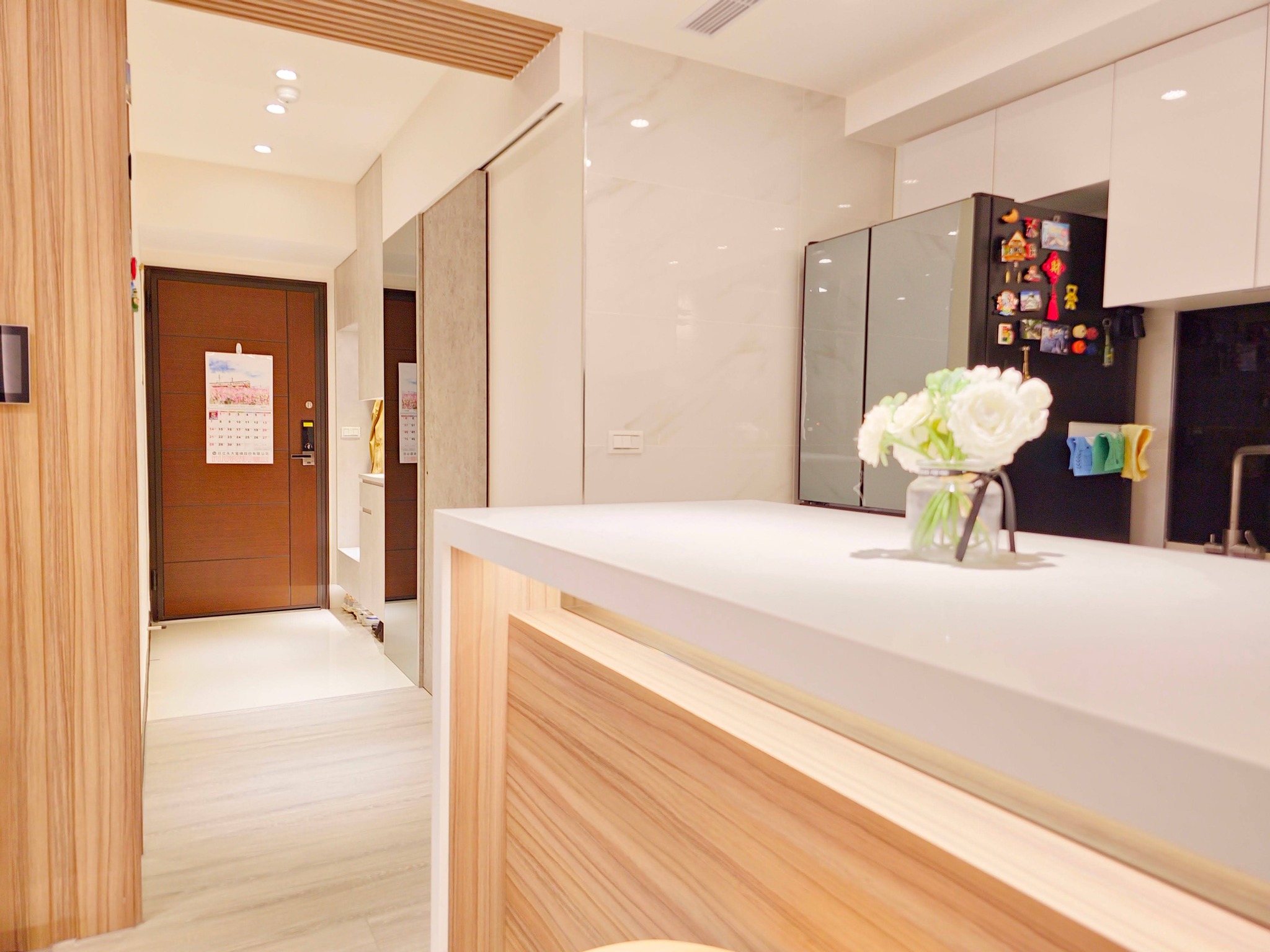 玄關的位置處做系統櫃讓東西更有收納的空間,利用鏡像的方式,讓狹小的空間有放大感的效果!還可以當穿衣鏡使用~~